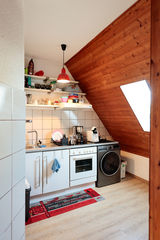 Obwohl die obere Etage der Maisonette-Wohnung offiziell nur als Hobbyraum angegeben ist, geht das Angebot hier deutlich über eine herkömmliche Nutzfläche hinaus. In der oberen Etage finden Sie neben einigen Staumöglichkeiten auch ein voll funktionsfähiges Duschbad vor, eine kleine Küche, einen großen Aufenthaltsraum mit Holzkamin für gemütliche Abendstunden und haben zugleich einen wunderschönen Blick über die Dächer Wuppertals. Die obere Etage kann sowohl über die Raumspartreppe aus dem Wohnzimmer heraus oder direkt über das Treppenhaus selbst erreicht werden.