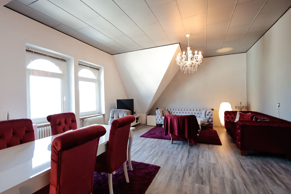 Eine elegante Raumspartreppe führt in die obere Etage der Maisonettewohnung, die rund 50 m² umfasst. Diese Fläche ist nicht als Wohnfläche genehmigt und laut Teilungserklärung als Hobbyraum deklariert. Die jetzigen Mieter nutzen die Räume jedoch zu Wohnzwecken. Der Umstand, dass die obere Etage nicht zur offiziellen Wohnfläche zählt, wurde bereits bei der Kaufpreisfindung berücksichtigt